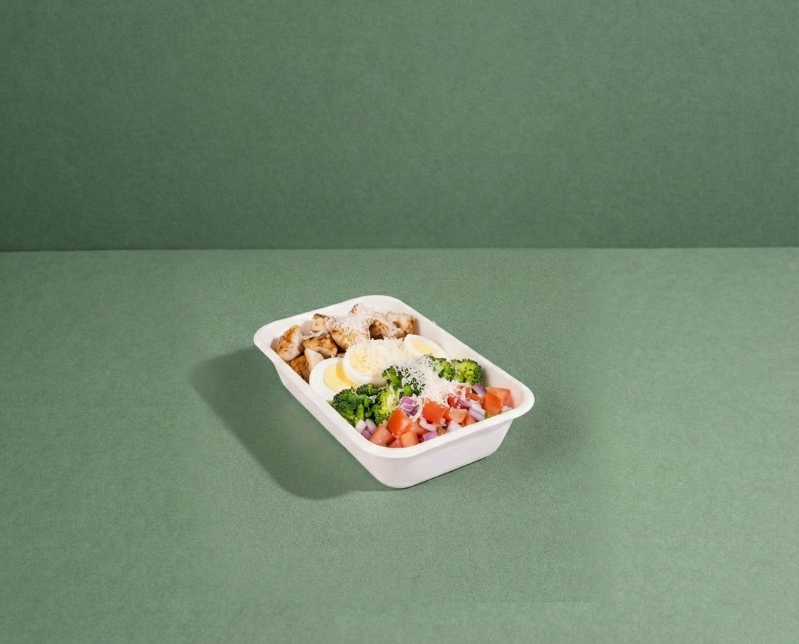 warm roasted chicken, free range boiled egg, kale mix, parmesan crisps, cherry tomatoes, parmesan, rocket, chopped cos, lime wedge, cracked pepper
