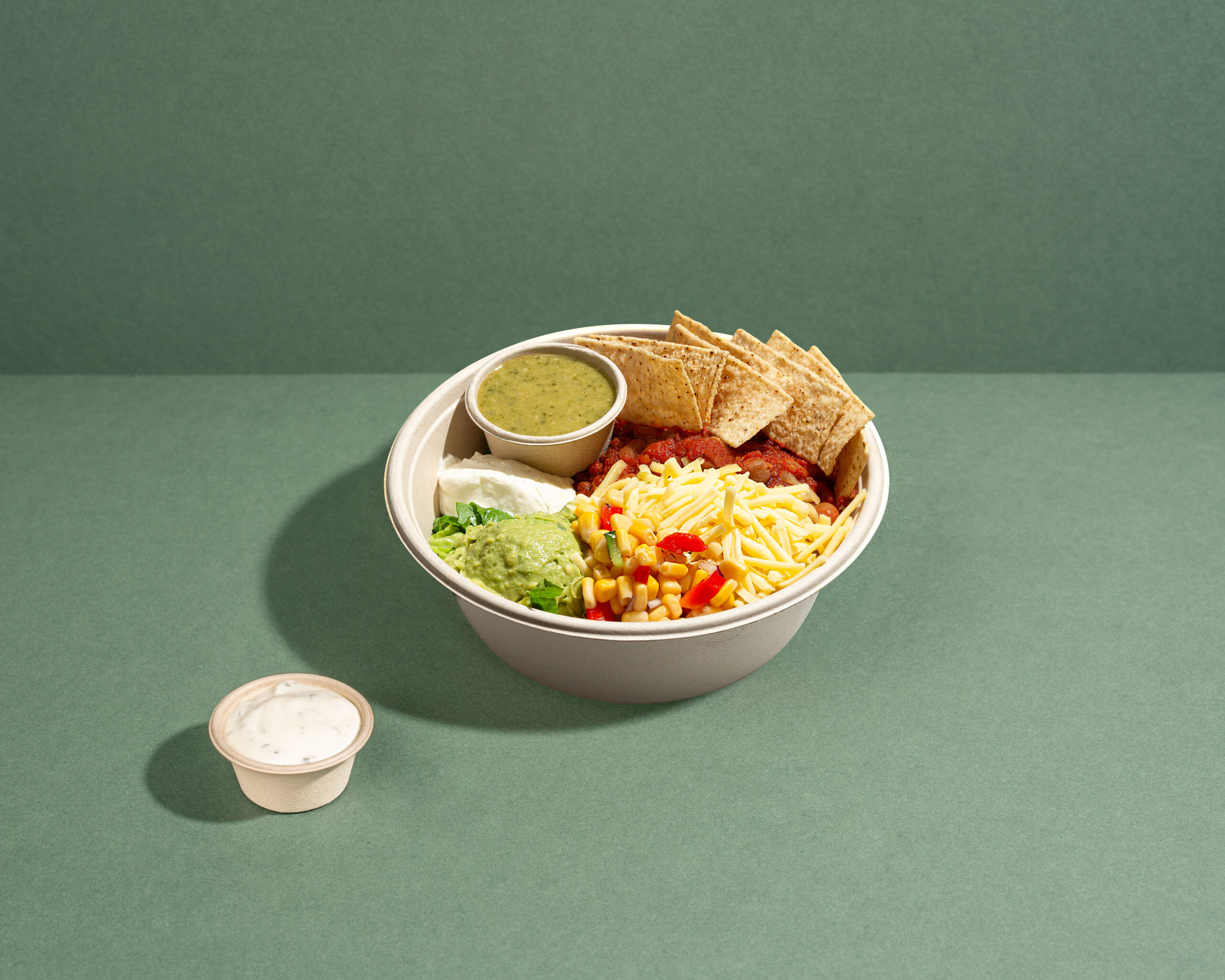 plant-based chilli, sour-cream, cos, avocado, cheddar cheese, corn, tomato + onion, tortilla strips